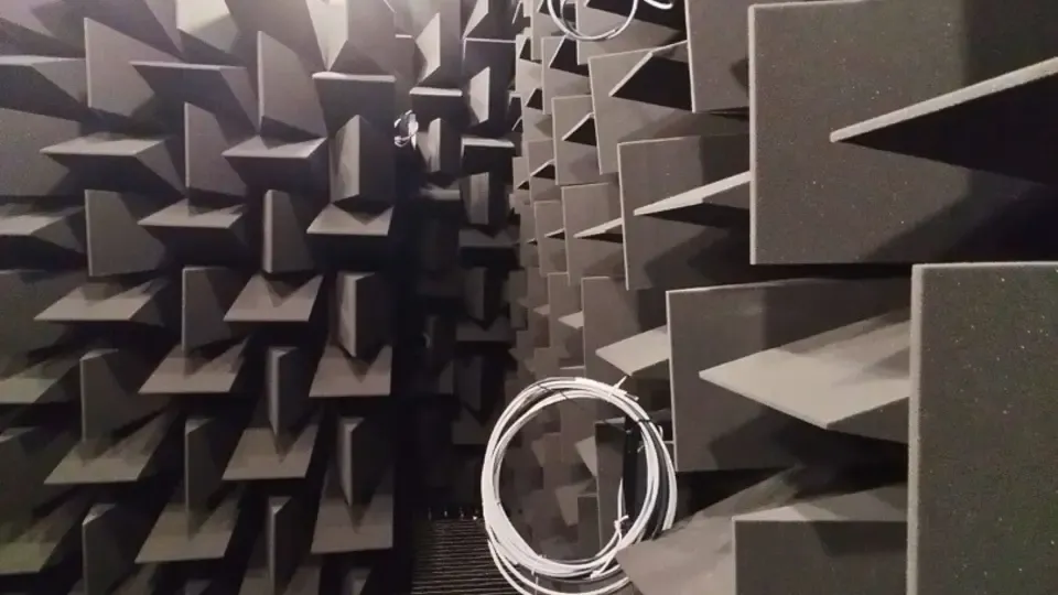 - Zwei schalltote Kammern: Eine große Kammer mit 1402 Kubikmetern und einer Grenzfrequenz von 50 Hz und eine kleinere Kammer mit 319 Kubikmetern und 100 Hz. In beiden Räumen mussten echte Freifeldbedingungen geschaffen werden, in denen der Schall wie im Freien verschwindet.